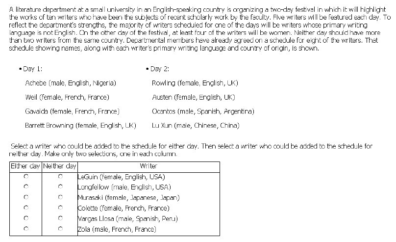i. 根据要求 3),可知Day 1 必须加女性:仅考虑LeGuin,Murasaki 和Colette;